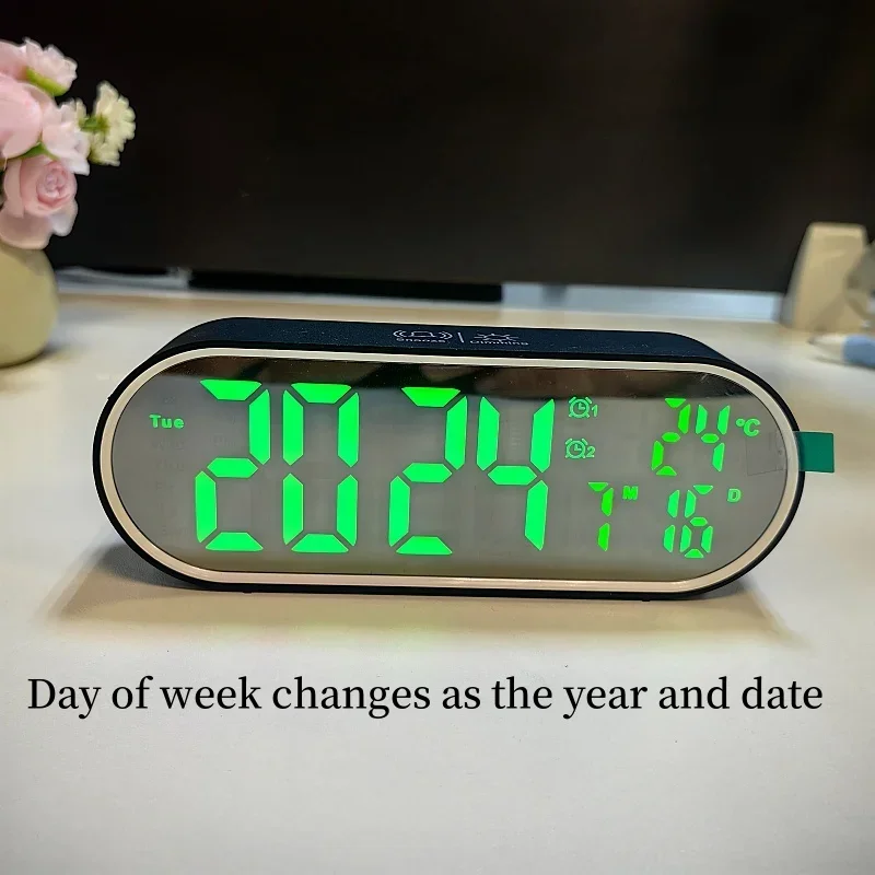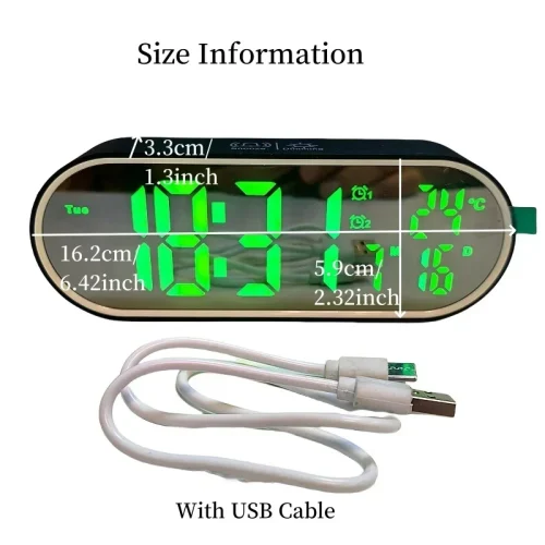 Rechargeable Digital Alarm Clock TEMP Date Week 2 Alarms Night Mode Snooze 12/24H Anti-disturb Voice Control LED Mirror Clock
