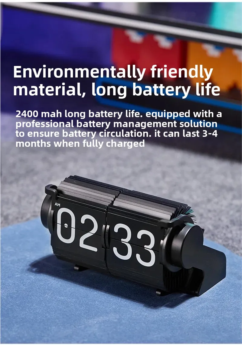 2. Battery Powered: Powered by a 2400mAh battery, this mechanical flip desk clock is stable and accurate, offering a battery life of 3 to 4 months on a full charge.